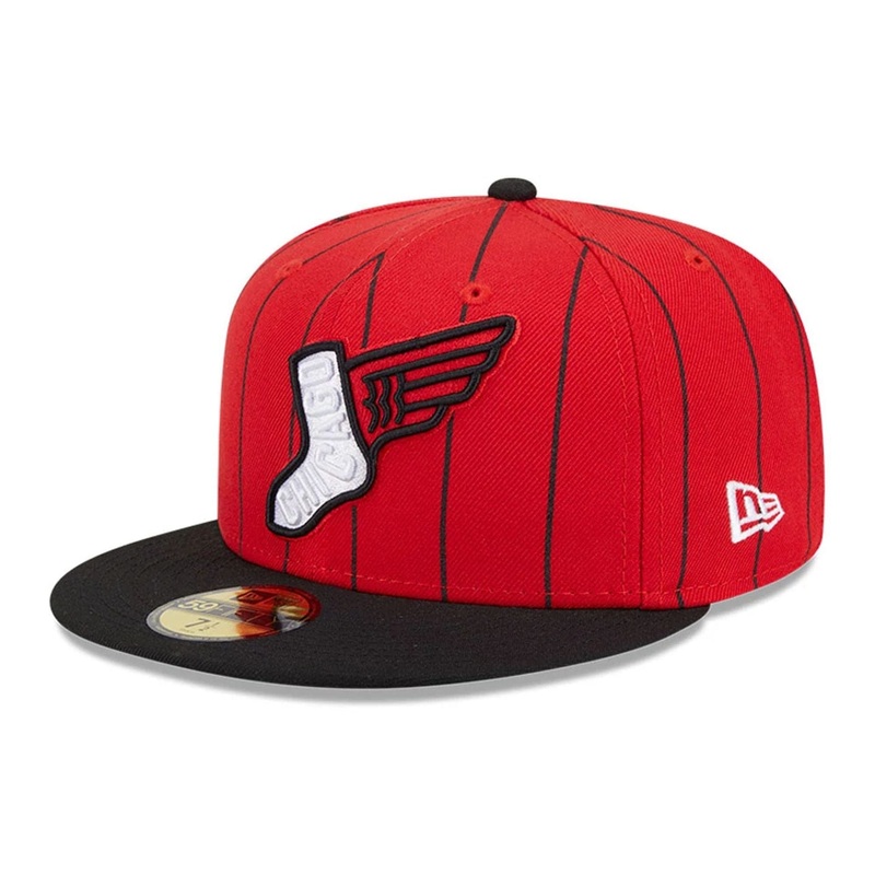 MLB City Connect Chicago White Sox Red 59FIFTY Fitted CapChicago White Sox City Connect logo on frontMLB logo on rearSouthside Chicago wordmark inner headbandNew Era Flag embroidered on leftStructured pinstripe crownFittedFlat black visorBlack undervisor10