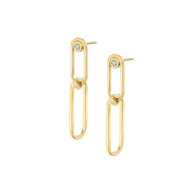Instantaneous elevation. A duo, a shiny flat gold link with bezel set diamond in thetop linked forever to agold hoop link for a seamless look through your lobes.