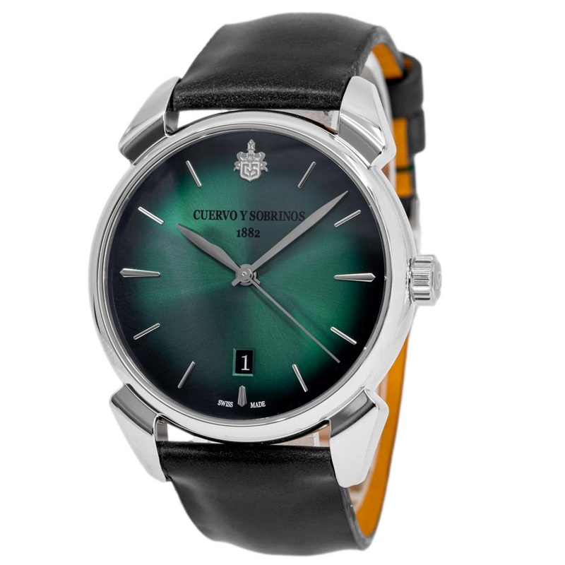 TECHNICAL DATABrand: CuervoySobrinosFamily: HISTORIADORReference: 3101.1ASVName: Cuervo Y Sobrinos 3101.1ASV Historiador Asturias AutoCASEMaterial: SteelGlass: Sapphire GlassDiameter: 40 X 40Case Thickness: 9,9Water Resistance: 3 ATMDIALColor: GreenDial Markers: No numeralsBezel: –MOVEMENTType: AutomaticCalieber: CYS 5124Base Caliber: La Joux-Perret G100Jewels: 28Reserve: 38 BANDMaterial: LeatherColor: BlackClasp: DeploymentFUNCTIONSDate,OTHER FUNCTIONSLuminescent Hands,Luminous indexes ,Power Reserve Display,