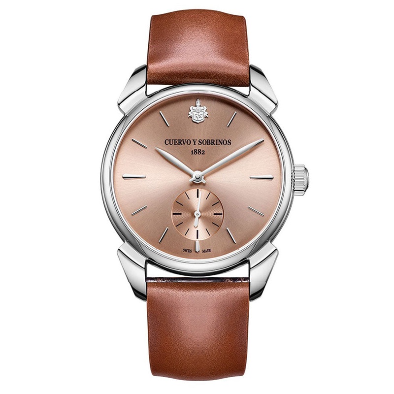 TECHNICAL DATABrand: CuervoySobrinosFamily: HISTORIADORReference: 3102.1ASSName: Cuervo y Sobrinos 3102.1ASS Historiador Asturias 40mm AutoCASEMaterial: SteelGlass: Sapphire GlassDiameter: 40 X 0Case Thickness: 11,5Water Resistance: 5 ATMDIALColor: ChampagneDial Markers: No numeralsBezel: Stainless SteelMOVEMENTType: AutomaticCalieber: CYS 5159Base Caliber: SW 261Jewels: 31Reserve: 38 hoursBANDMaterial: LeatherColor: BrownClasp: Fold claspFUNCTIONSSmall Second,OTHER FUNCTIONSDisplay back,