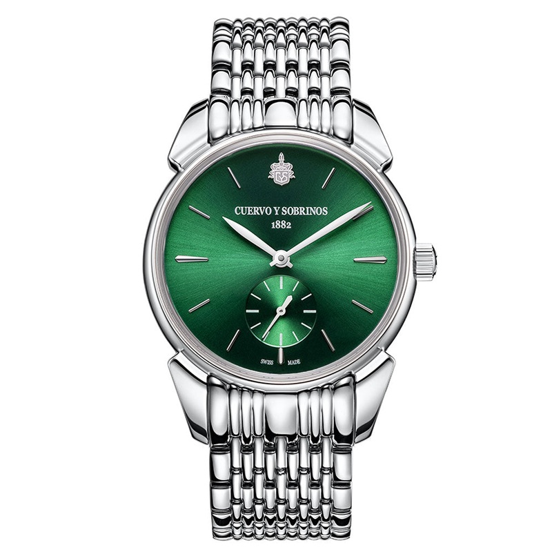 TECHNICAL DATABrand: CuervoySobrinosFamily: HISTORIADORReference: 3102B.1ASVName: Cuervo y Sobrinos 3102B.1ASV Historiador Asturias 40mm AutoCASEMaterial: SteelGlass: Sapphire GlassDiameter: 40Case Thickness: 11,5Water Resistance: 5 ATMDIALColor: GreenDial Markers: No numeralsBezel: Stainless SteelMOVEMENTType: AutomaticCalieber: CYS 5159Base Caliber: SW 261Jewels: 31Reserve: 38 hoursBANDMaterial: Stainless SteelColor: SteelClasp: Fold claspFUNCTIONSSmall Second,OTHER FUNCTIONSDisplay back,
