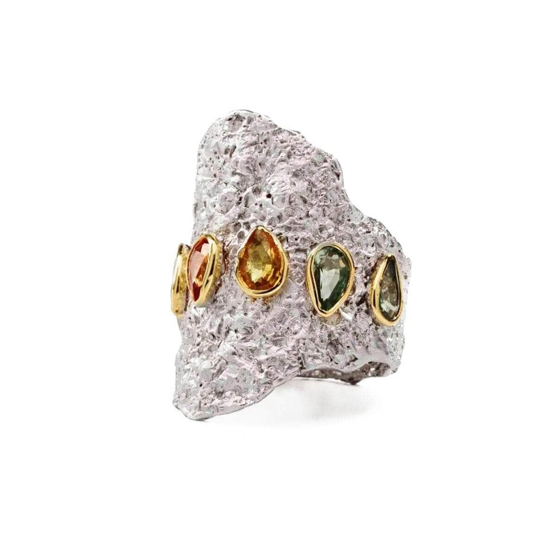 A circle can represent eternity and this ring has an eternal soul. Blessed with a series of scattered mixed flat cut sapphires this white rhodium piece offers up a battle of texture, color and form that fills the soul with ecstacy. Rivulets of gold snake their way across the jewels and further add to their brilliance.