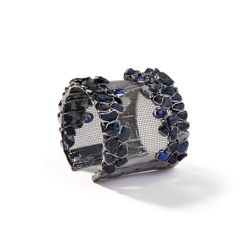 This bracelet represents a revolutionary step in jewelry design, made by the visionary . It unites titanium mesh and silver in a daring and unconventional manner, with uncut raw blue sapphires scattered along its edges. This one-of-a-kind contemporary piec