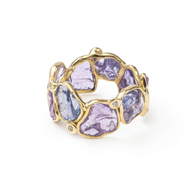 This ring from the Cyrus series is exquisitely crafted in solid 14K gold, featuring German Kabirskis specialized technique of encasing gemstones by wrapping them in metal. This version highlights raw fancy sapphires with a predominant pink hue, each stone