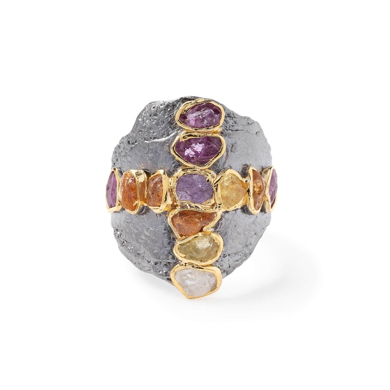 Featuring an intriguing mix of gemstones, this one-of-a-kind ring showcases mixed color sapphire, ruby, chrysoberyl, and spessartine (mandarin) garnet arranged in two crossed lines. These stones are fully natural, unspoiled, and not even cutpreserved just as they were discovered, with no human interference. Encircling the stones is a delicate 18K gold plating. The band, originally textured with Kabirski’s hallmark organic pattern, is plated with black rhodium for a durable finish. This unique ring is perfect for an equally distinct person ready to embark on life’s adventures with a truly different piece of jewelry.