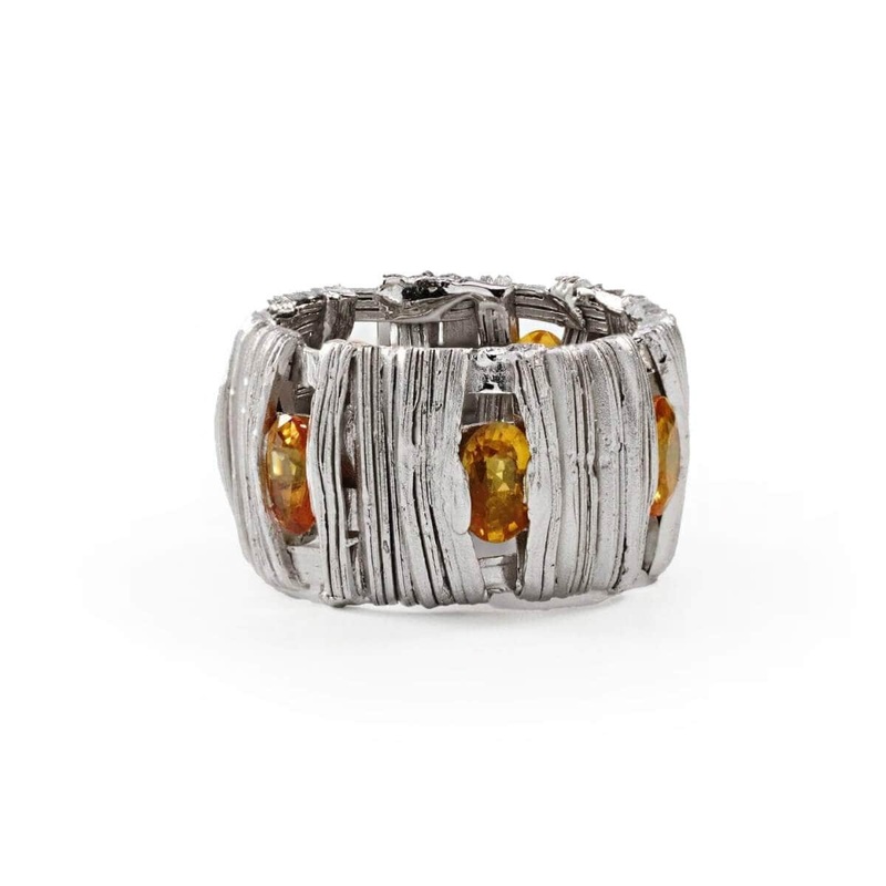 White rhodium has been crafted with artisan hands to create a dynamic ring. Mixed sapphires suffuse their light outwards in a burst of color as they glimmer beneath the waves of precious metal.