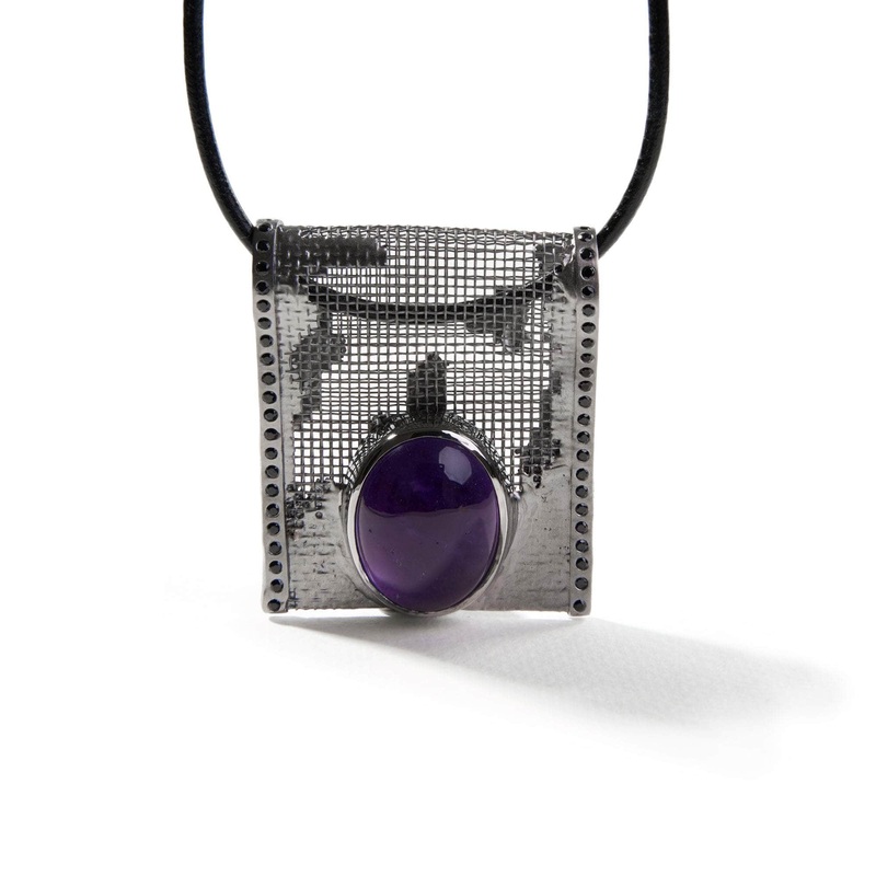 This quirky pendant crafted of silver and a new jewelry material introduced by our visionary designer titanium mesh. This unusual combination creates a wabi-sabi aesthetic, celebrating the circle of life and the beauty of imperfection. Adorned with a large natural amethyst cabochon, accentuated by delicate round-cut black spinel lines, it’s a singular piece meant for just one soul in the world who dares to wear art jewelry as an expression of their individuality.