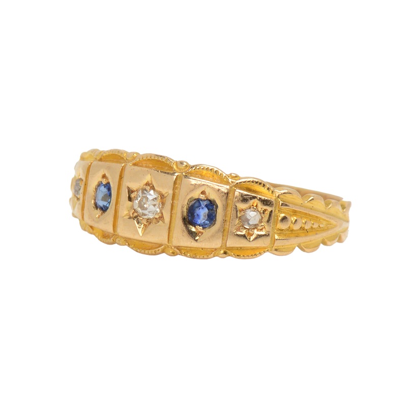 This ring, designed in Birmingham, England in 1900 and adorned with subtle embellishments from every angle, fulfills all the necessary requirements.