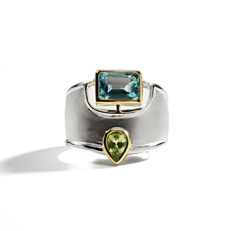 Shapes and colors combination - do you ever get bored of those in pieces? The variety is endless.Metal: 925 SilverStones: Blue Topaz, PeridotPlating: White Rhodium, 18K GoldWidth 19 mmBand wide 6 mmLength 20 mmWeight 9.39 g