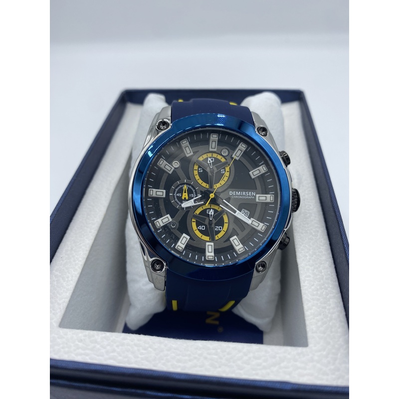 This Demirsen chronograph features a 42mm case, bright blue bezel, black dial with blue outlined chronograph dials with arrow hands and a yellow second hand. This watch comes on a blue rubber strap and is the perfect everyday watch .