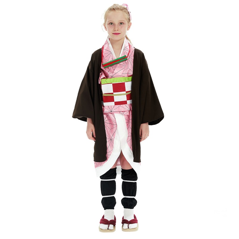 Demon Slayer: Kimetsu no Yaiba Halloween Carnival Suit Kamado Nezuko Cosplay Costume Kids Kimono Outfit MaterialJacquard Fabric + Kadan Fabrics Package included:Belt + Coat + Hairclips + Inner Wear + Leglet + Ribbon + Two Toe SocksSize/cmHeightBustS110-120