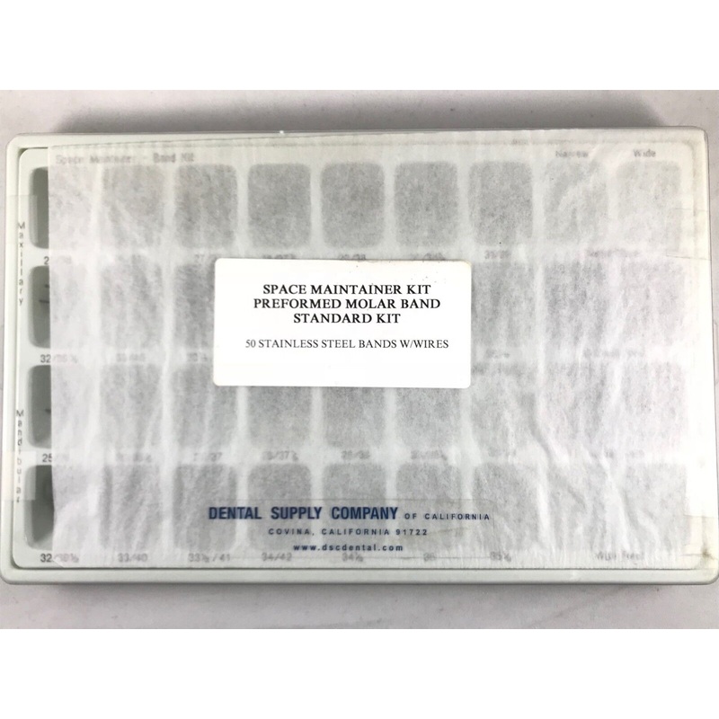 Space Maintainers kit contains one of each size for total of 50 Bands and 50 WireL25, L26, L27, L28, L29, L30, L31, L32, L33, L33 1/2, L34, L34 1/2, L35, L35 1/2, L36, L36 1/2, L37, L37 1/2, L38, L38 1/2, L39, L39 1/2, L40, L41, L42U25, U26, U27, U28, U29,