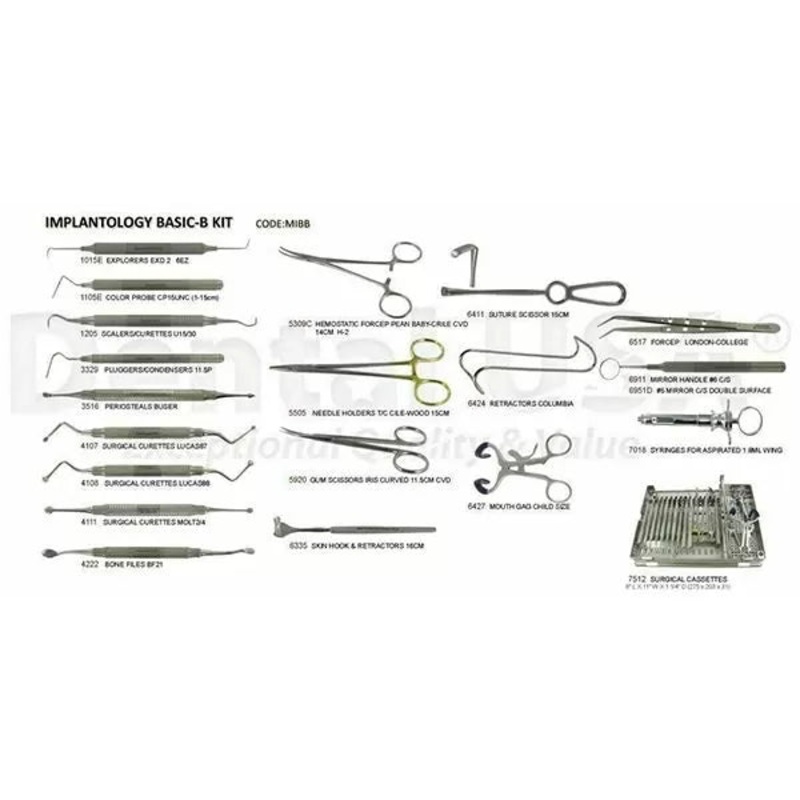 Includes: Dental USA Implantology Basic-B Kit 440A Stainless Steel Apex 1015E EXPLORERS EXD 2 6EZ 1105E COLOR PROBE CP15UNC (1-2-3-4-5-6-7-8-9-10-11-12-13-14-15) 6EZ 1205 SCALERS/CURETTES U15/30 3329 PLUGGERS/CONDENSERS 11.5P 3516 PERIOSTEALS BUSER 4107 SU