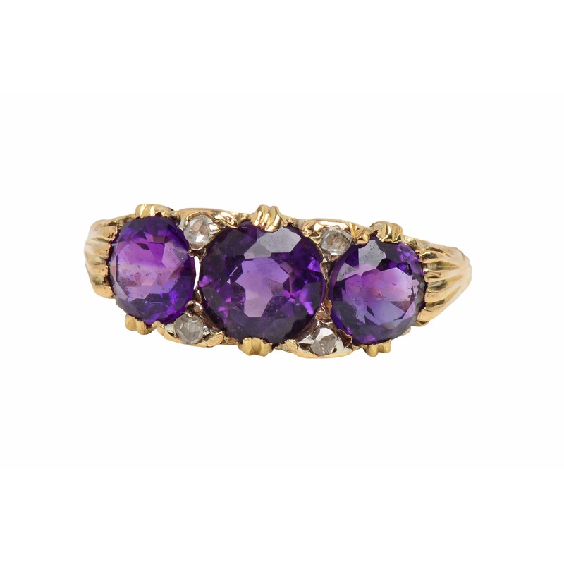 A trio of these luscious and lively natural amethysts lines the finger with striking hues. In between, tiny rose-cut diamonds impart hints of glitter.