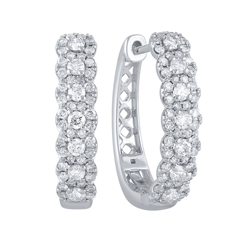 Add a touch of glamour to your day. Beautifully crafted in 10K white gold, these hoop earrings are adorned with a total of 102 round brilliant diamonds for a total diamond weight of 1.00 carats.