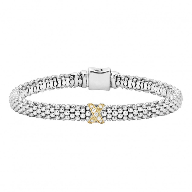 Pav diamond 18k gold x station on a sterling silver Caviar beaded bracelet. Finished with a signature box clasp detailing the LAGOS crest. Ideal for layering. LAGOS diamonds are the highest quality natural stones.Size MSterling Silver & 18K Gold0.07 CaratB