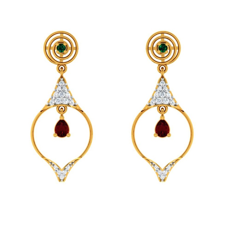 This graceful piece of jewel by Amazea collection is best for women or college girls who like to keep it simple. 18K gold and diamond earrings look beautiful with a drop-shaped dangler and a maroon stone hanging in between. Diamonds are studded in drop sha