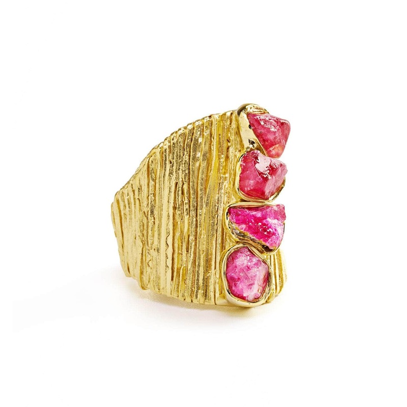 Ridged gold surfaces and lines of etched passion have created this organic and unforgettable ring. A line of rough pink spinel gemstones slices its bright expression through the heart of this special piece. Color and light combine in this eclectic design t