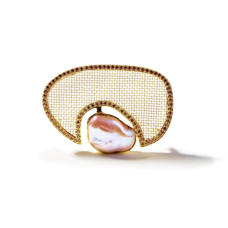 Simple and uncluttered, this contemporary silver brooch, plated with precious 18K gold, is a singular piece of ‘s unconventional jewelry art. It celebrates the beauty found in imperfections, showcasing a freely shaped natural baroque pearl, and the unique combination of silver and titanium mesh encircled by perfectly cut yellow sapphires. Going beyond jewelry trends, this modern piece empowers you with a distinctive perception of beauty and art.