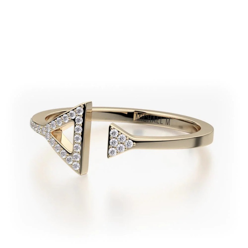This Double Diamond Triangle Ring consists of a delicate band leading to two diamond triangle finishes. Each triangle and a portion of the band is adorned with sparkling 0.13 carat round diamonds for a refined look. Available in 14K White Gold, 14K Yellow Gold, and 14K Rose Gold.