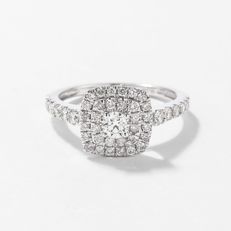 This elegant 14K white gold diamond engagement ring features a round brilliant centre diamond haloed by 44 beautifully laid pav shimmering diamonds. This radiant engagement ring is designed in Canada. Matching wedding band is available. Other sizes availab