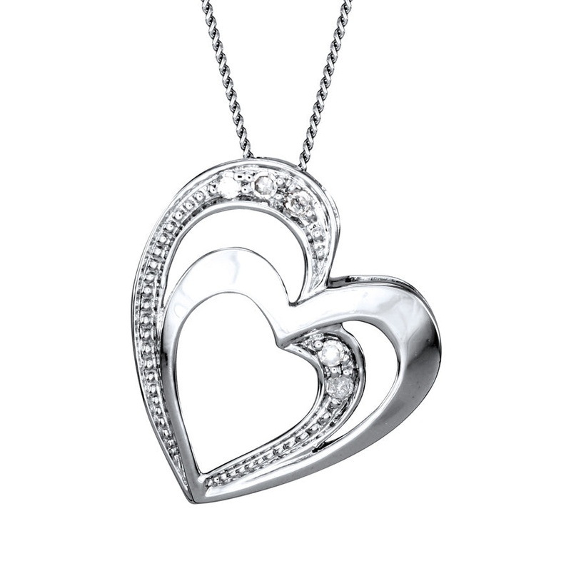 United in love! This double heart pendant, mounted with 5 sparkling round diamonds, is fashioned in 10K white gold. This heart pendant sparkles with 5 bright pav-set round diamonds. Designed in Canada and this romantic heart pendant floats from a 10K white