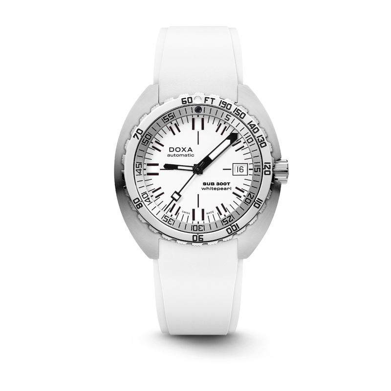 TECHNICAL DATABrand: DoxaFamily: SUB 300Reference: 840.10.011.23Name: Doxa Men’s 840.10.011.23 SUB 300T Whitepearl AutoCASEMaterial: Acciaio inossidabileGlass: ZaffiroDiameter: 42.5 X 0Case Thickness: 14Water Resistance: 120 ATMDIALColor: WhiteDial Markers: Without numbersBezel: Acciaio inossidabileMOVEMENTType: AutomaticCalieber: Swiss mechanical automatic, self-windingBase Caliber: -Reserve: 38BANDMaterial: RubberColor: WhiteWidth: 20.00 mmClasp: Pin buckle