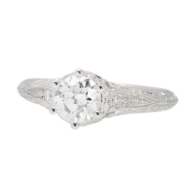 A fairy tale comes true with a classic 18k white gold engagement ring. Here is a ring which will have her say yes. Featuring an old European cut antique diamond of .95 carats (GIA J color; SI1 clarity), set in this this curvaceous and feminine profile.