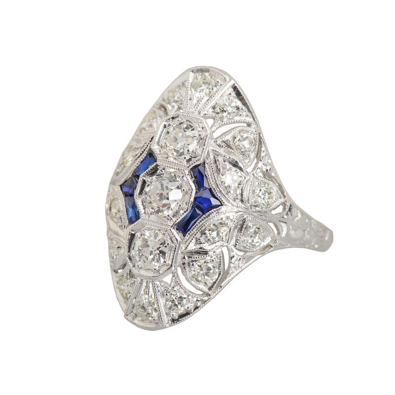 Six calibre synthetic (correct for the time period) blue sapphires impart focus to the center diamonds. In platinum, the setting combines engraving and mille grain details in a rounded marquise shape that elongates the finger and hand.