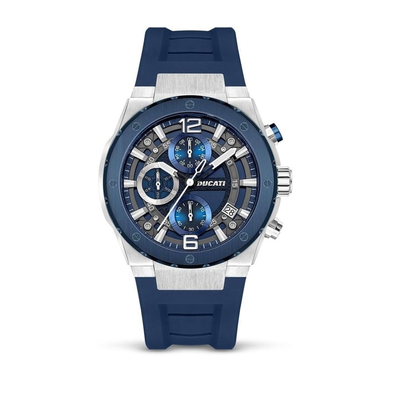 A bold chronograph watch that embodies Ducatis design and functionality. Featuring 2 push buttons and a blue partial seethrough dial with striking contrast accents this timepiece lets you own the spirit of the ride. The patterned robust blue silicone strap adds a touch of ruggedness the perfect blend of form and function for the modern rider.