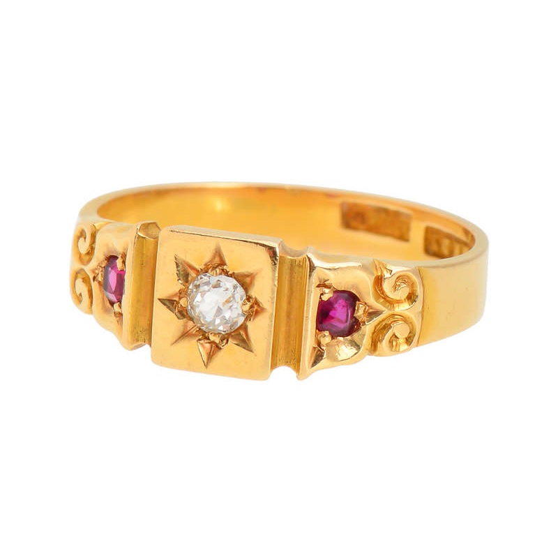 Each of the stones is gypsy set (below the surface) with the diamond in a star surround. The band or shank is plain and with a soft polished surface.