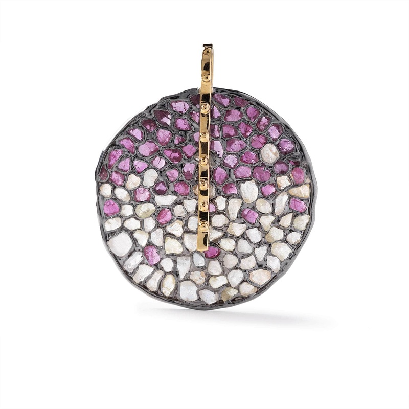 This designer pendant from 's award-winning Stained Glass collection is crafted from 925 silver, plated with 18K gold and black rhodium. It features a unique circular arrangement of rough ruby and chrysoberyl crystals, showcasing the brand's innovative sta