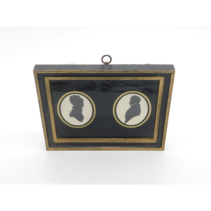 Details: A fantastic and wonderfully designed antique early Victorian framed pair of silhouette cutout portrait miniatures showing a couple facing each other with notes to the back of the frame dating the item c1840. This is a wonderful item that would mak