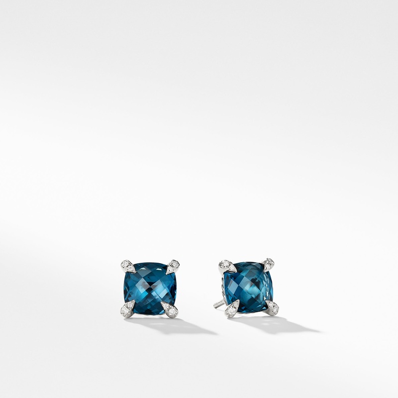 Sterling silver Faceted Hampton BlueTopaz, Pav diamonds, 0.09 total carat weight, Earrings, 9x9mm, Ref: E12834DSSAIBDI