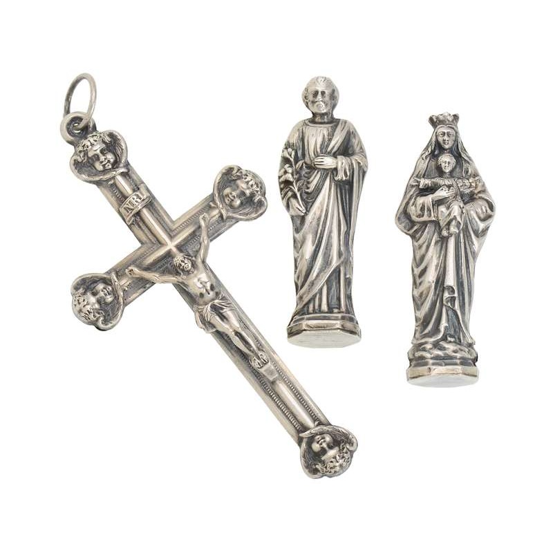 Beside him are the crowned Mary with Baby Jesus, and Joseph, both in flowing robes. Constructed in repouss? (hollow and stamped out in relief) the three are light in weight.