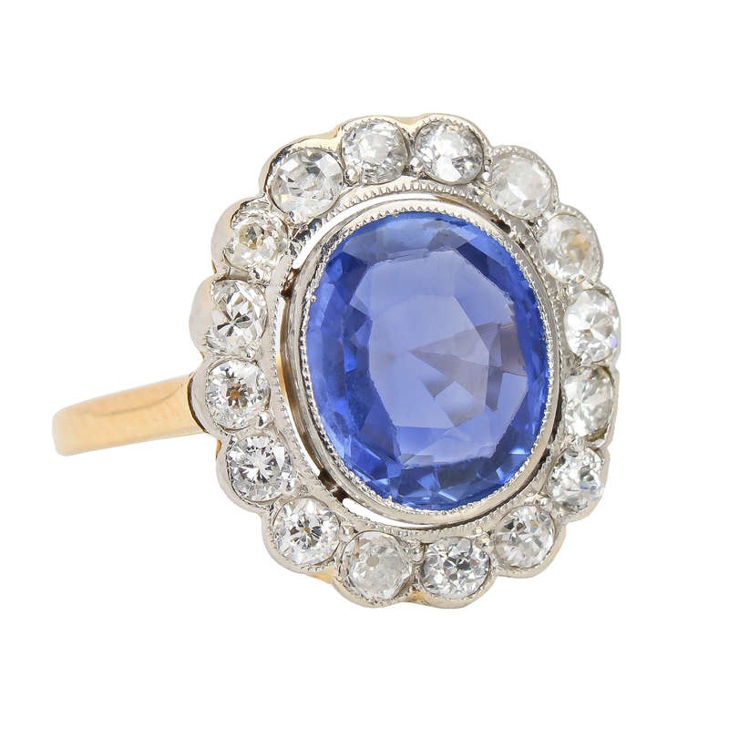 Entirely eco-friendly and antique in date, the highlight is a Ceylon colored oval sapphire of 1.80 carats. Radiant and cool, with medium to light but distinct blue tones, there are traces of lilac and purple hues in this regal gemstone.
