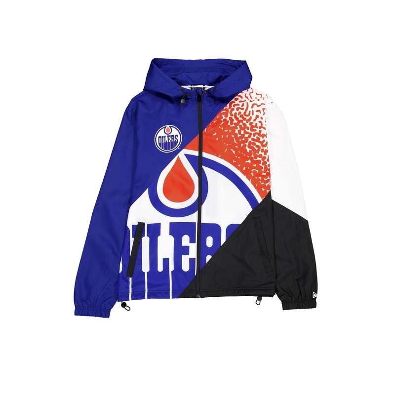 The Edmonton Oilers Sport Classics Color Block Windbreaker features a screen-printed Oilers logo at the right chest and an alternate team logo at the left wrist. Additional details include a sublimation printed team graphic across the front and a full zip closure.