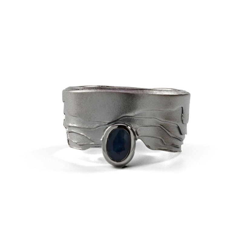 Ribbons and layers of black rhodium lace their way around this dramatic ring. A single blue sapphire pierces the darkness, casting out its brilliant light as a beacon of artistry.Metal: 925 SilverStones: Blue SapphirePlating: Black RhodiumWidth 18 mmBand w