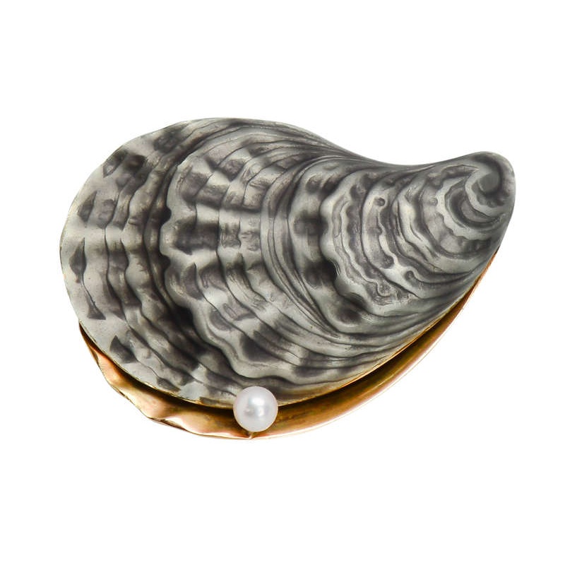 Any month, with or without an "R" in the month, is perfect for donning this realistic oyster shell brooch.The firm of Alberts & Son, established in 1915 in Newark, New Jersey, created this amazingly lifelike brooch.On 14k gold, the top is enameled to resem
