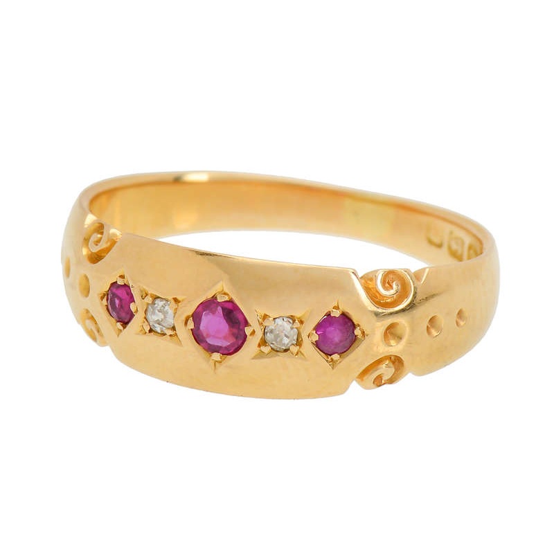 Rubies and diamonds make up this 18k yellow gold ring dating to circa 1900. Three rubies comprise .17 carats of a weight and two old single cut make up .04 carats of weight with a color of H-I and a clarity of SI1-2.