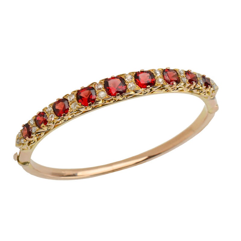 SPECIAL MARKDOWN. Exceptional Value.A crackling cozy fire or sizzling hot garnets? You must admit, garnets win.This antique Edwardian hinged, bangle bracelet imparts that frisson of magic from every angle.Nine scintillating and super cinnamon-hued garnets