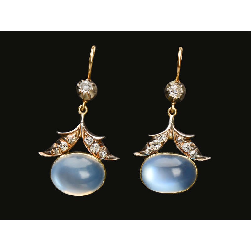 Dangle drop earrings in a medium length combine shimmering antique oval moonstones with sparkling old mine cut diamonds for a combination exceptional!Cut en cabochon, two oval moonstones (total weight of 7.0 carats) shimmer clear and blue with arches of fo