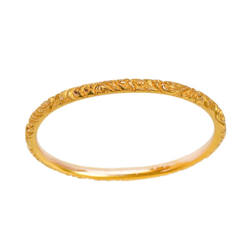 In mint condition, this dated 1904 bracelet of solid 14k yellow gold will take you back to yesteryear and propel you forward in chic style.Such a fine Edwardian accessory, the oval slip-on bangle is fully patterned with a deep stylized feather design. To t