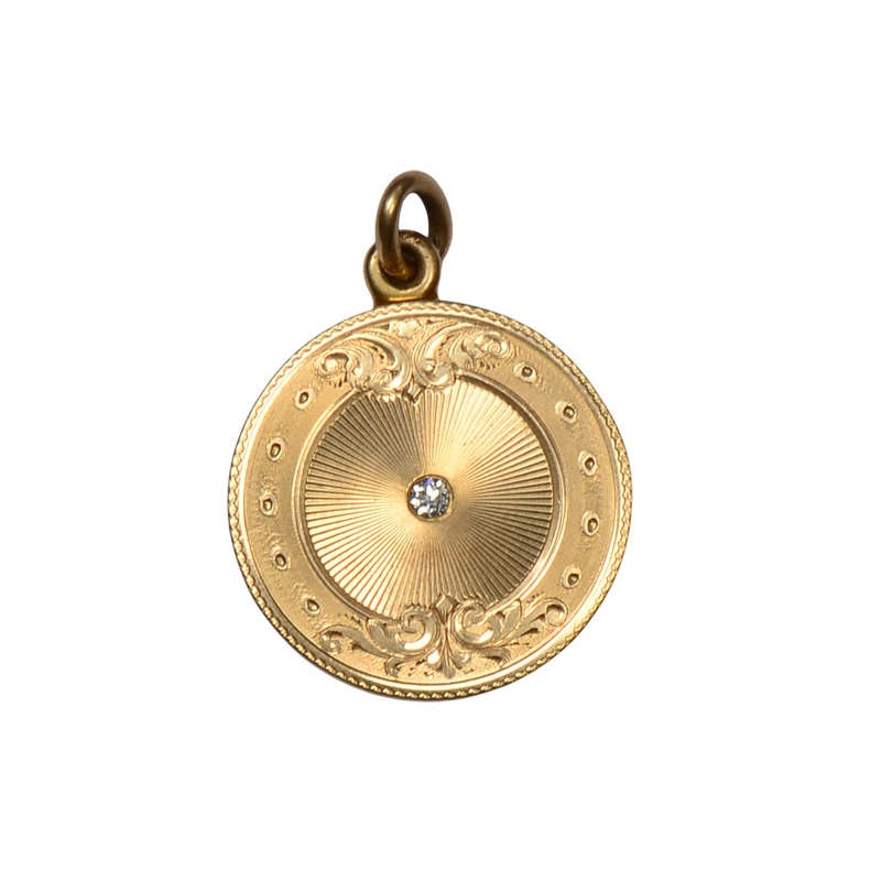 Here a round 14k gold locket comes alive with a medley of designs emblazoned on the front. A sunray pattern emanates from the center where a dainty old European cut diamond sparkles away.