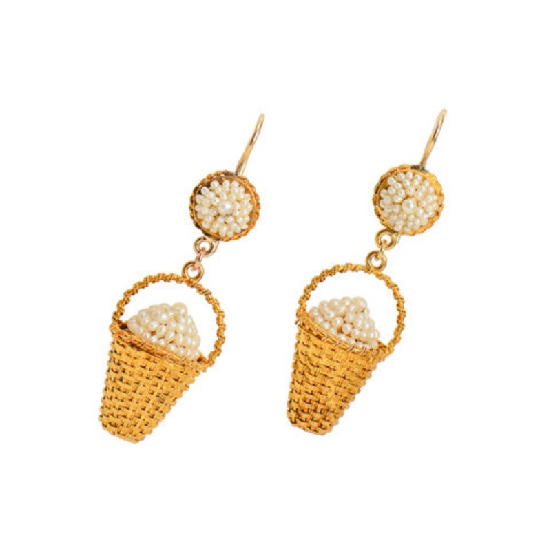 Here is a most fantastic pair of antique Victorian earrings which look as though they came out of a fairy tale about a princess.The design is a basket of eggs. Charming in composition and masterful in craftsmanship, strips of 14k yellow gold have been made