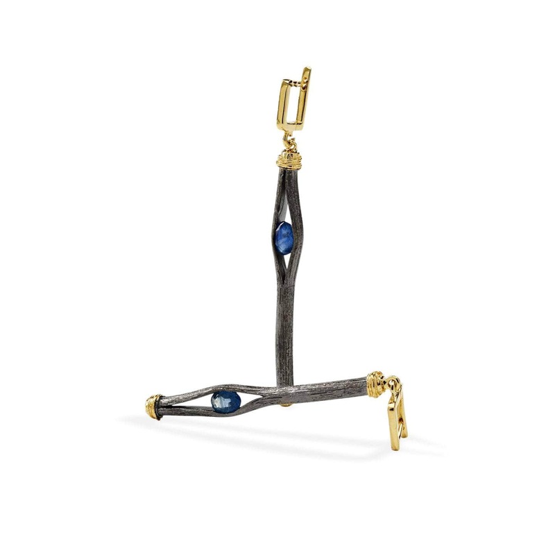 Brilliant blue sapphires emerge from the chrysalis of earthly bondage to pierce the world above with their light. Elegant gold details trim the crown of these Earrings and create a twinkling dance that battles with the deepest black rhodium. Precious metal