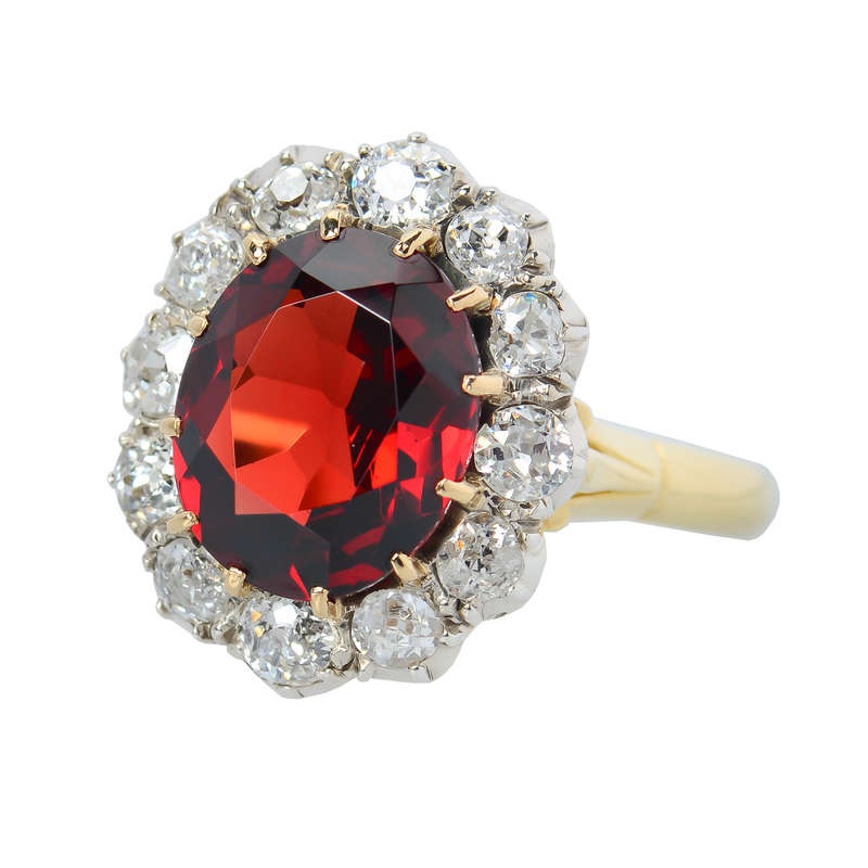 With a garnet as warm as an open-air fire and diamonds as brisk and scintillating as the chill night air just beyond the flames' influence, this ring simply lights up your nights or days. A superb oval, faceted claret-hued garnet of 3.85 carats sizzles fro