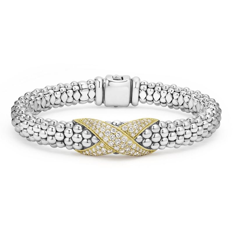 Smooth 18K gold, diamonds, and sterling silver Caviar beading form this X station bracelet. LAGOS diamonds are the highest quality natural stones.