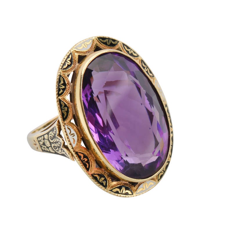 Its a balance between this oversized, fine amethyst and an exceptionally enameled gold setting.