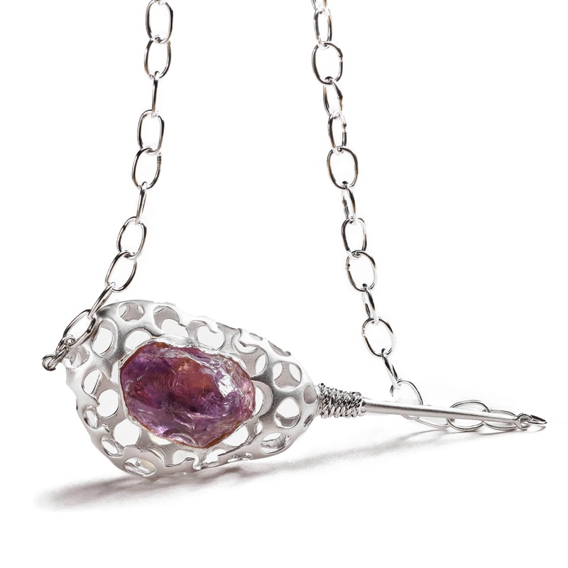 A rough amethyst sparkles at the heart of this while rhodium necklace. Pale textured precious metal creates a magical setting for this lustrous jewel. Raw and organic form are celebrated in this design.